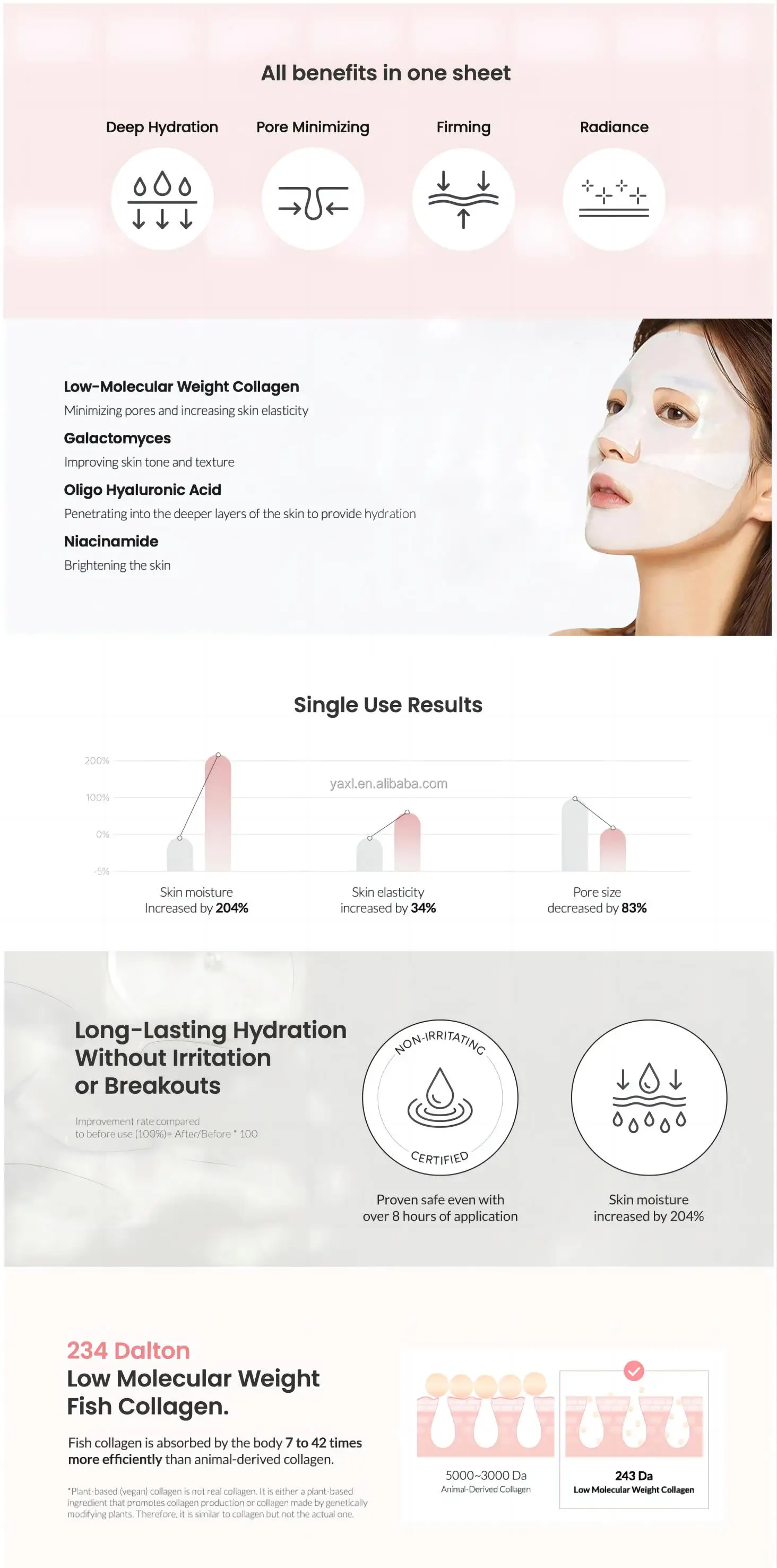 💧 Unlock the secret to radiant skin! Our Bio Collagen Deep Hydrating Mask set includes 4 premium Korean sheet masks, expertly crafted for luxurious moisturization and revitalization of your skin.✨ Why you need it - Say goodbye to dryness and dullness! Our masks are designed to:- Deeply hydrate and nourish your skin for a radiant glow.- Combat signs of aging with powerful collagen ingredients.- Provide a spa-like experience right at home, perfect for a self-care day or quick hydration boost on the go.🌟 Why you’ll love it - Customers adore our deep hydrating masks for their superior quality and results:- Made with premium ingredients for a luxurious feel.- Captivating Korean beauty innovation that keeps skin youthful and plump.- Conveniently packaged, making it easy to pamper yourself or share with friends.📜 How to use it - Simply cleanse your face, apply the sheet mask, relax for 15-20 minutes, then peel off and gently massage any excess serum into the skin for maximum benefits.🔒 Enjoy peace of mind with our quality guarantee! Experience glowing skin and indulge in the luxury of hydration. Order now and elevate your skincare routine! Limited time offer, don’t miss out!